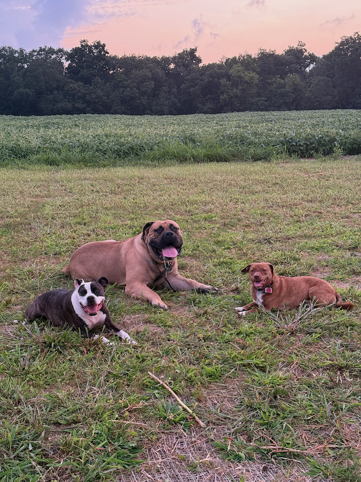 When Kobe joined our family, his big sister Laney (AmStaff Terrier) was thrilled. Cha-Ka, our 28-pound mix was a little skeptical though. Now, this trio spends most of the day together and Cha-Ka has learned that grooming Kobe’s jowls can be a rewarding experience.