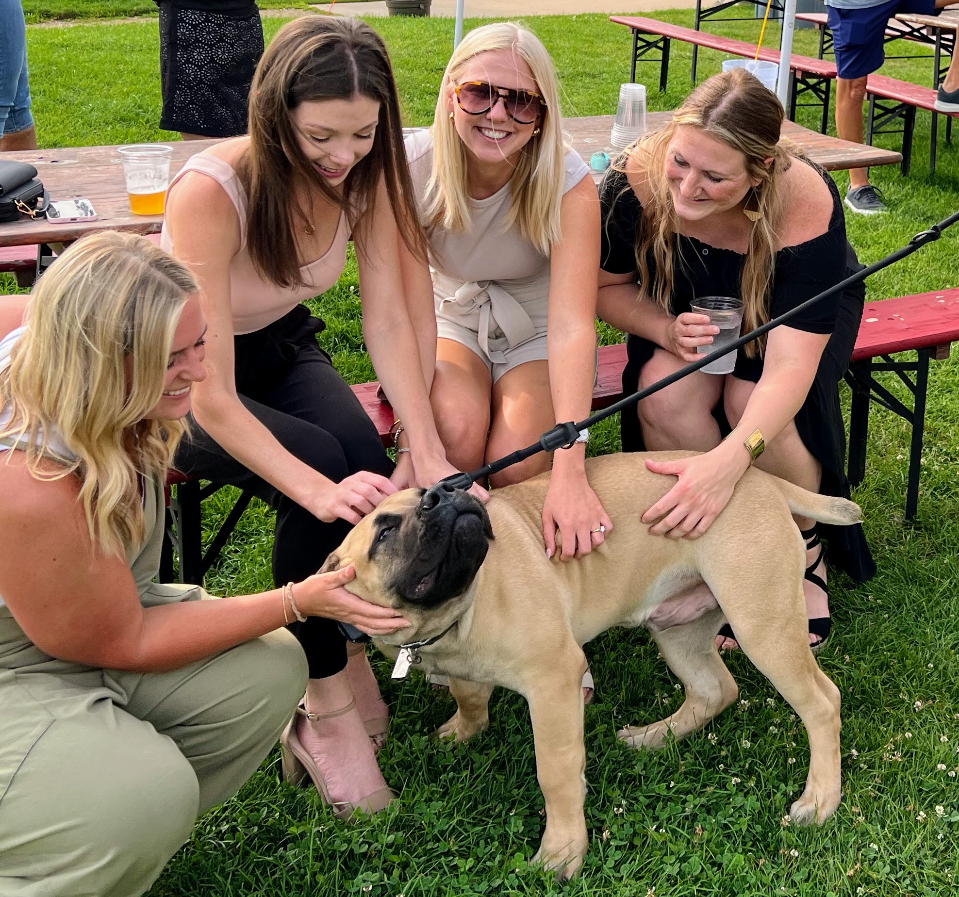 Because his temperament is relaxed and fun-loving, Kobe is able to join us for occasional outings to the local beer garden where he is a big hit with the ladies. He’s happiest at home though, running alongside the EZ-GO or keeping an eye on things while Jeff is on the tractor.